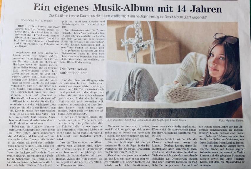 Die 14-jährige Singer-Songwriterin LIONY begeistert mit ihrem Debütalbum „Echt unperfekt“, das am 5. September 2025 erscheint. Bereits eine Woche zuvor, am 29. August, wurde die gleichnamige Single veröffentlicht. LIONY, mit bürgerlichem Namen Leonie, lebt in der Nähe von Nürnberg und vereint in ihrer Musik Einflüsse aus Pop, Folk, Funk, Hip-Hop und Elektronik – inspiriert von den 80er-, 90er- und 2000er-Jahren.